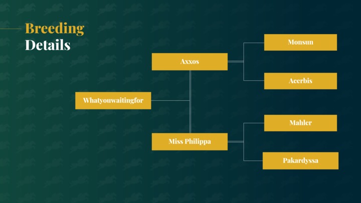 WhatYouWaitingFor is by Axxos and out of Miss Philippa.